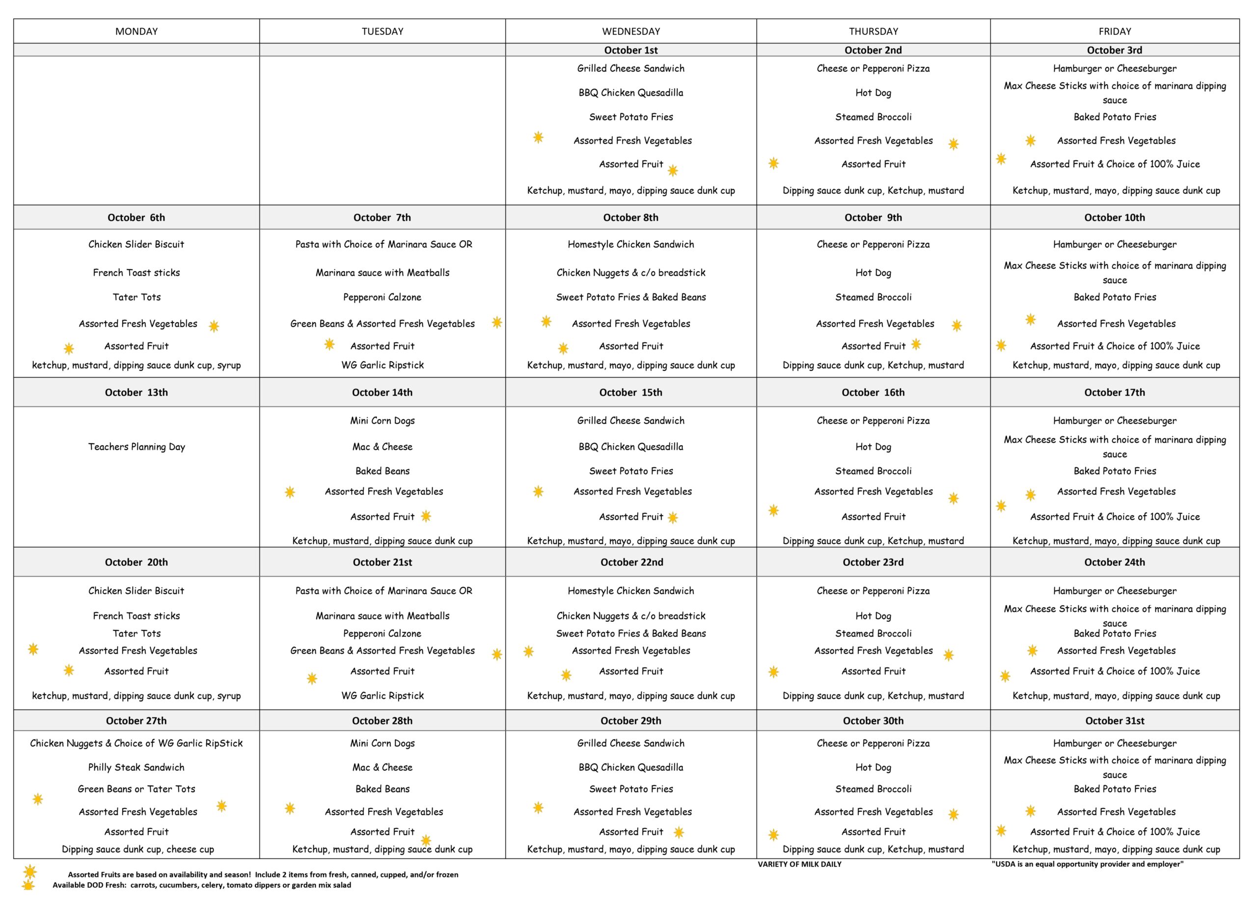 To receive lunch at the standard price, students must include either a fruit or vegetable in their selection. For instance, a classic Cheeseburger with Milk and Apple Slices constitutes a complete lunch.